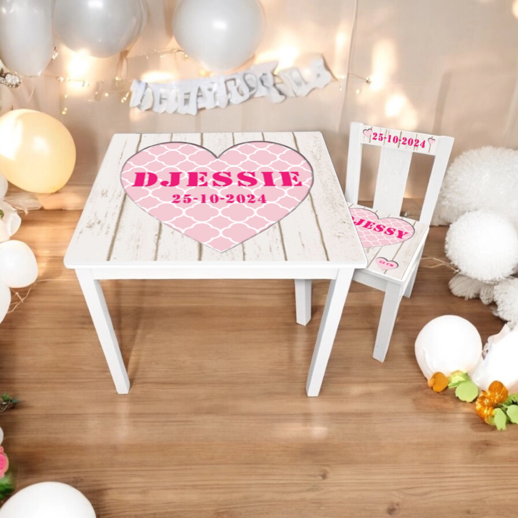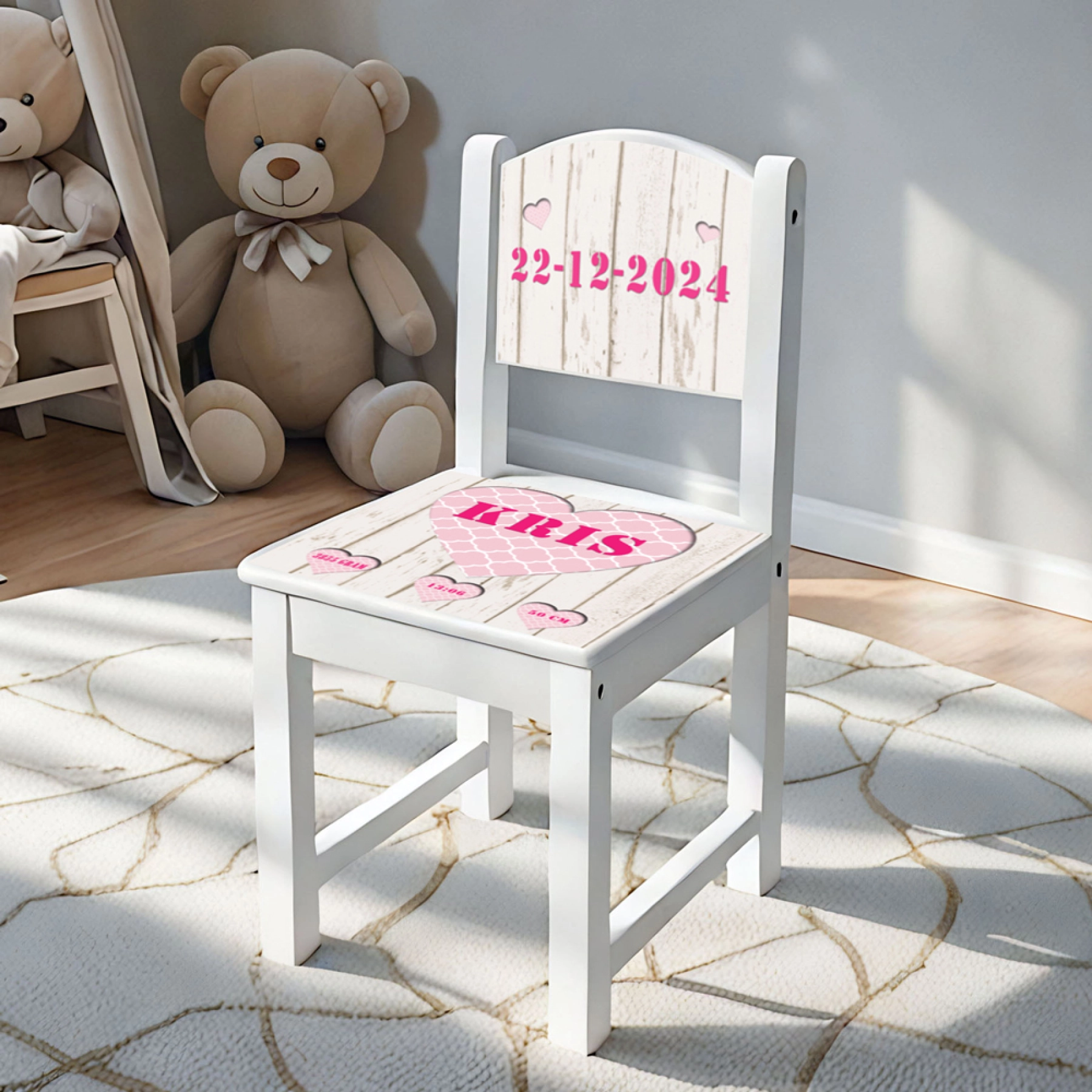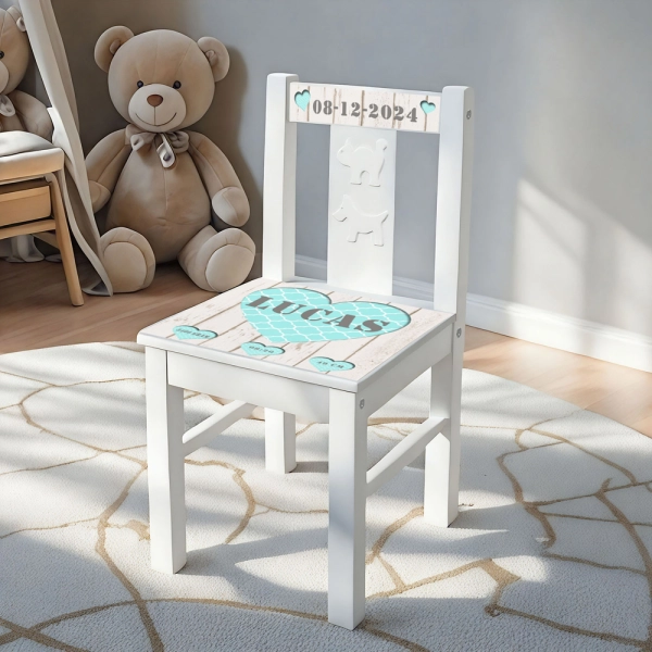 Geboortestoeltjes met een exclusief ontwerp speciaal voor de allerkleinste wondertjes. Dit stoeltje heeft een schitterend ontwerp met 3D harten waar de naam van het kindje in staat . In de kleine hartjes eronder staan de geboortedatum, geboortegewicht en de geboortelengte van het kindje. Alle informatie geeft u gemakkelijk door via het bestelformulier.