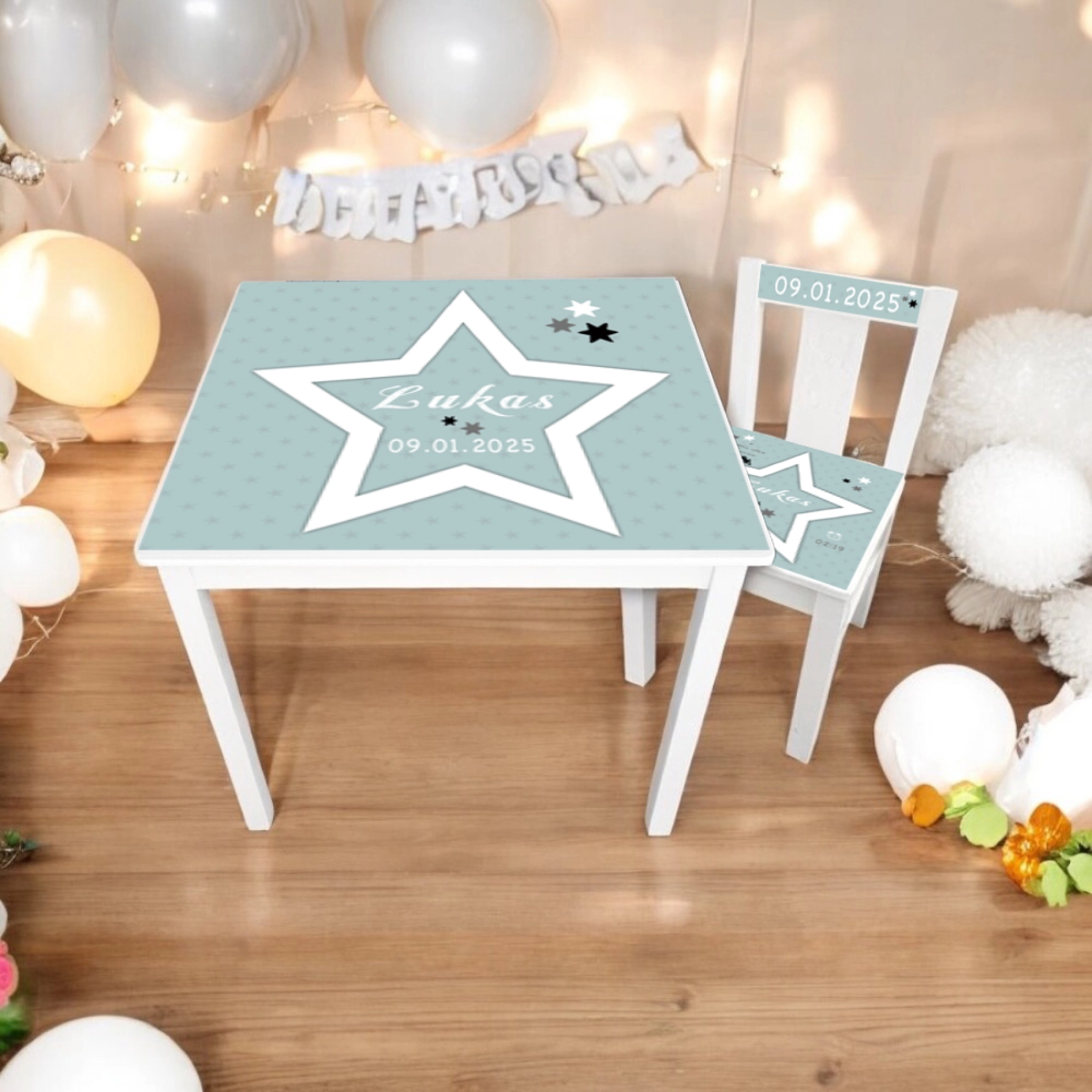 Een trendy ontwerp met sterretjes waar de geboorte informatie van het kindje ingeplaatst wordt. Het geboortestoeltje met naam sterren wordt uiteraard ook voorzien van de naam en de geboortedatum.
