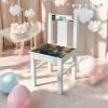 De kinderstoeltjes met naam zijn gemaakt van hout en zijn wit afgelakt. Het stoeltje is dankzij de vier stevige poten stabiel en ook voor jonge kindjes goed te gebruiken. In de rugleuning is een leuk speels hondje en katje aanwezig om het echt een kinderstoeltje te maken. Op de rugleuning van het stoeltje komt de naam te staan die u opgeeft bij uw bestelling. Heeft u liever de geboortedatum op de rugleuning dan kunt u hier de geboortedatum invullen