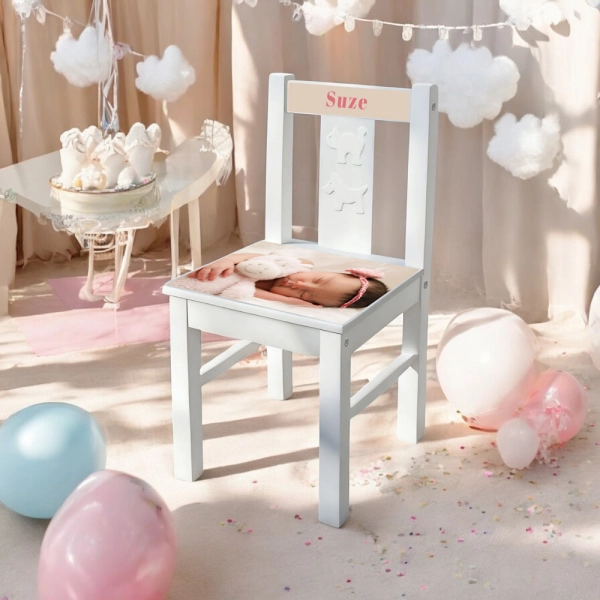 Vaak wordt er in het eerste jaar van het kindje een leuke baby foto shoot gedaan. Uiteraard komen hier schitterende foto’s uit en deze foto’s kunnen perfect gebruikt worden voor op het kinderstoeltje! Bij dit stoeltje kun je zien hoe mooi en scherp deze professionele foto’s eruit zien op de zitting van het houten kinderstoeltje. Uiteraard kun je als je handig bent met fotobewerking ook je eigen foto samen stellen en deze uploaden tijdens de bestelling. Ook hier geldt weer, heb je speciale wensen geef dit dan aan bij extra opmerking.