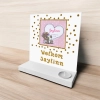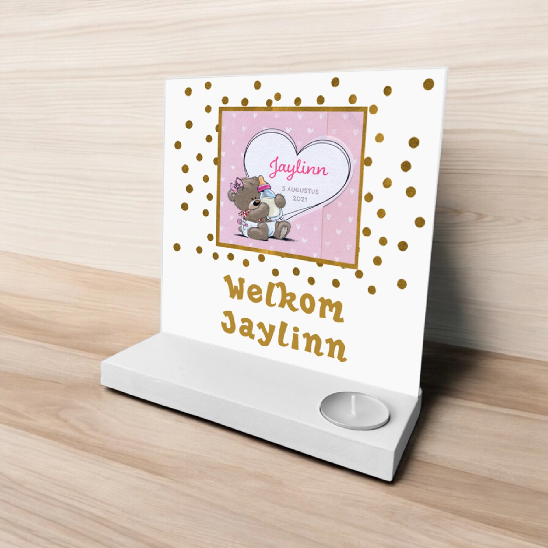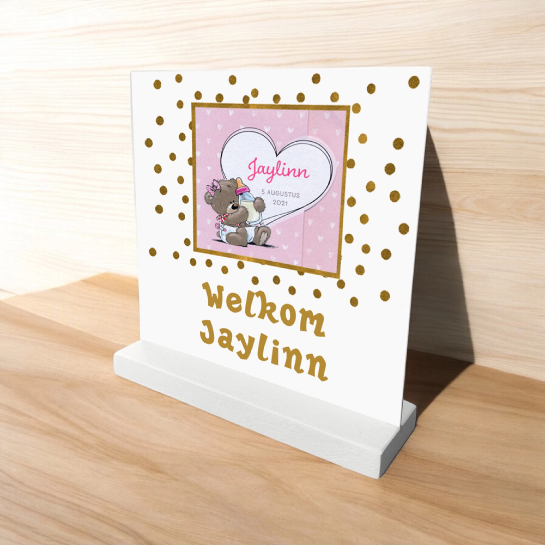 Plaats een mooie foto of geboortekaartje in het vierkantje met een tekst onder de afbeelding om het zo persoonlijk mogelijk te maken.