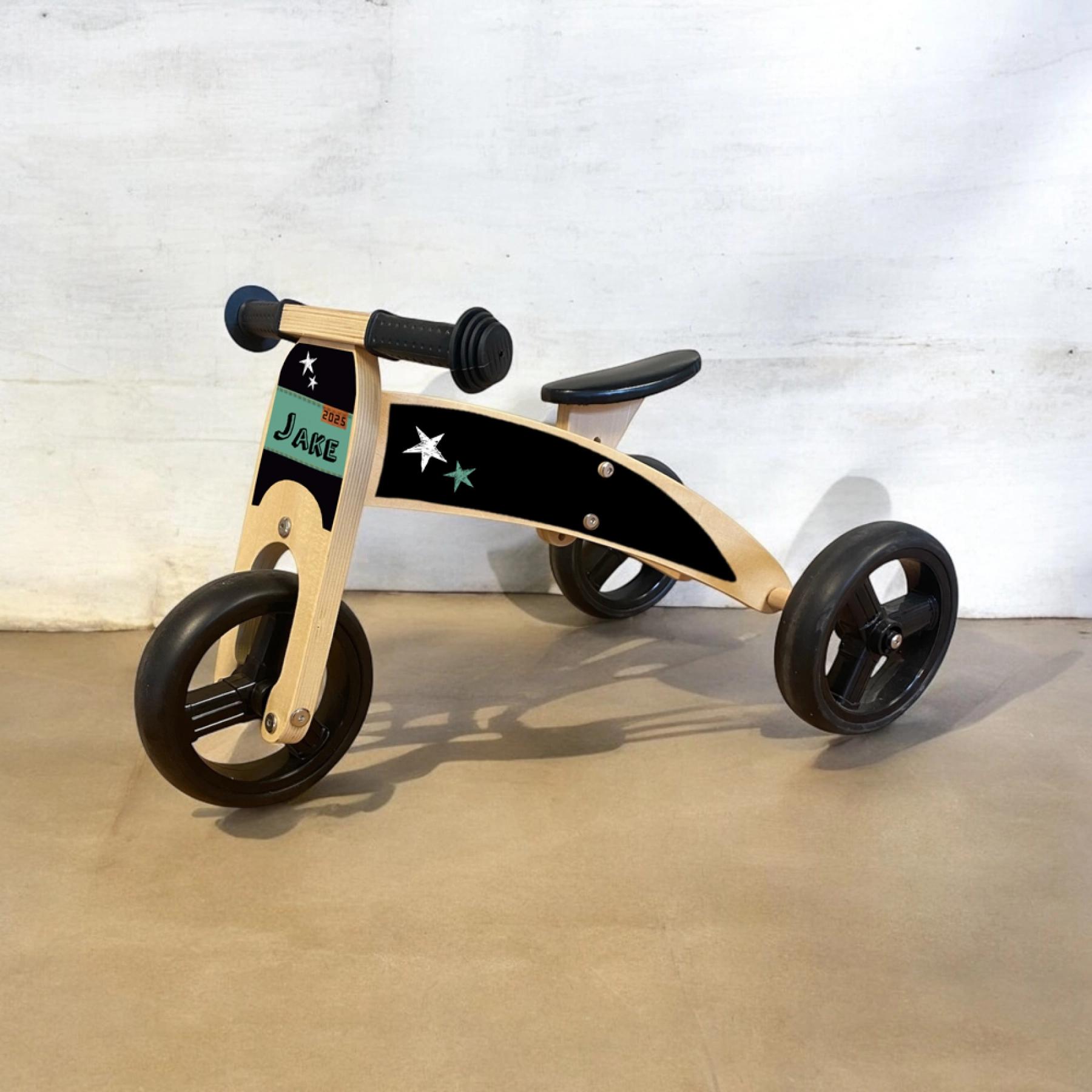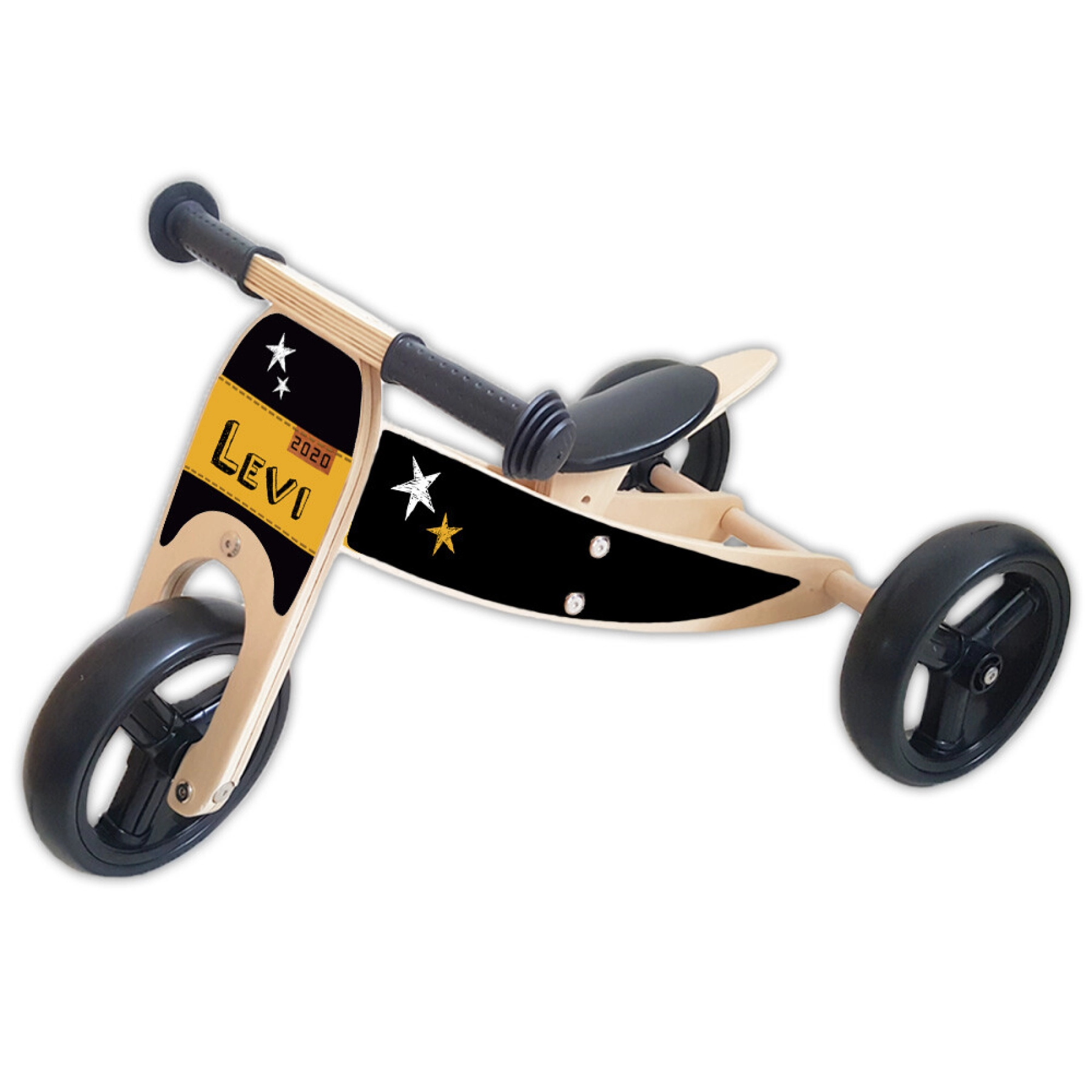 Loopfiets driewieler en tweewieler in 1! Super handig fietsje waar lange tijd gebruik van gemaakt wordt dankzij het 2 in 1 frame. Naam en geboortejaar worden verwerkt in het ontwerp op het fietsje.